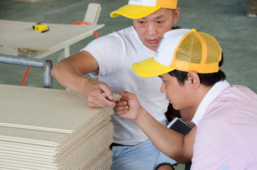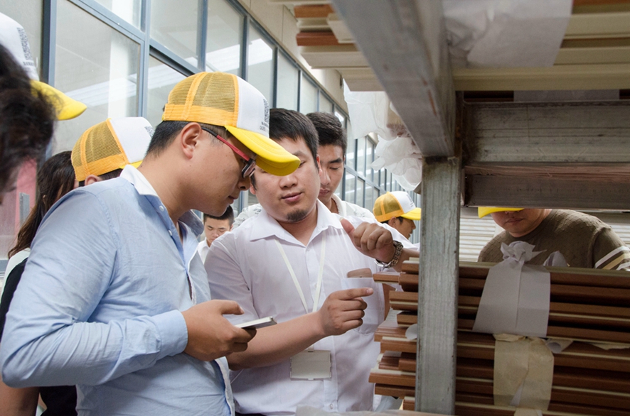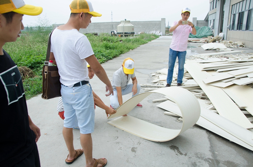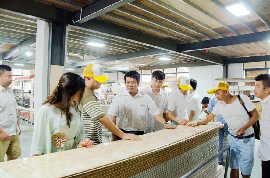 午后細(xì)雨,紅旗飄飄,客戶們熱情依然高漲。在萇總的帶領(lǐng)下參觀先后參觀了覆膜車間和基材生產(chǎn)車間。客戶紛紛對(duì)整齊劃一的