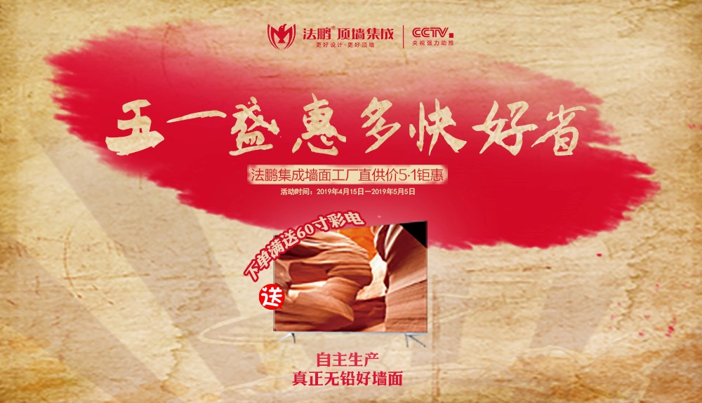 變化無(wú)常的四月已經(jīng)過(guò)半,熱情似火的五一近在咫尺?!拔逡患已b旺季”來(lái)臨之際,為了給全國(guó)家居裝修用戶搶先奉送真正無(wú)鉛無(wú)醛好墻面,由法鵬頂墻集成總部全程策劃的大型促銷——“五一盛惠 多快好省“主題活動(dòng),已于2019年4月15日——5月5日,正式拉開(kāi)帷幕,席卷全國(guó)。