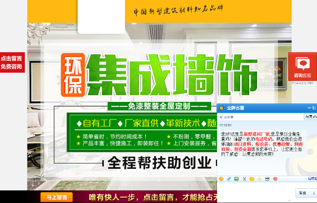 打開這幾個(gè)網(wǎng)址進(jìn)入后,就會(huì)發(fā)現(xiàn),這些網(wǎng)頁展示的全是環(huán)保集成墻面加盟信息,五顏六色的網(wǎng)頁傳達(dá)著誘人的項(xiàng)目和加盟政策,并且網(wǎng)頁立即會(huì)跳出彈框,聯(lián)系你并索要電話號(hào)碼,且在尾端會(huì)讓您留言讓您填寫加盟信息。