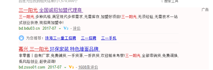 根據(jù)舉報(bào)人提供的搜索引擎,我司工作人員經(jīng)過搜索引擎框內(nèi)搜索“三一陽光”發(fā)現(xiàn),跳出來的首頁前兩個(gè)鏈接都顯示了“三一陽光”,而且這些都標(biāo)注了廣告。
